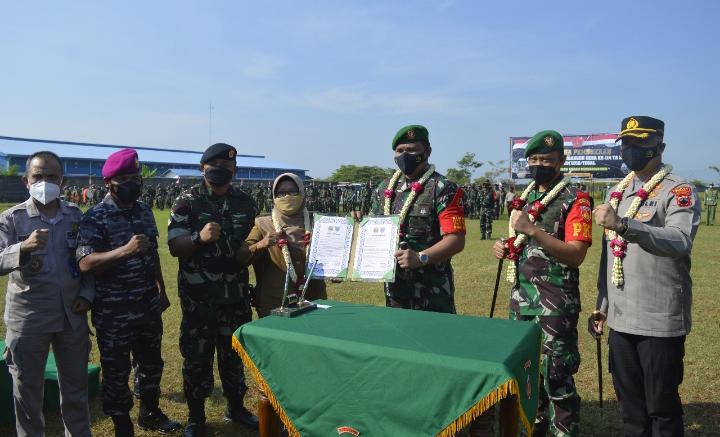 Pembukaan TMMD tersebut dihadiri oleh para pejabat TNI-Polri, Muspida Kabupaten setempat, tokoh agama, pemuda hingga masyarakat dan organisasi kemasyarakatan. Kegiatan diawali dengan penandatanganan serta penyerahan naskah serah terima dari Bupati kepada Dansatgas yang dilaksanakan secara terbatas dan menerapkan Prokes ketat.