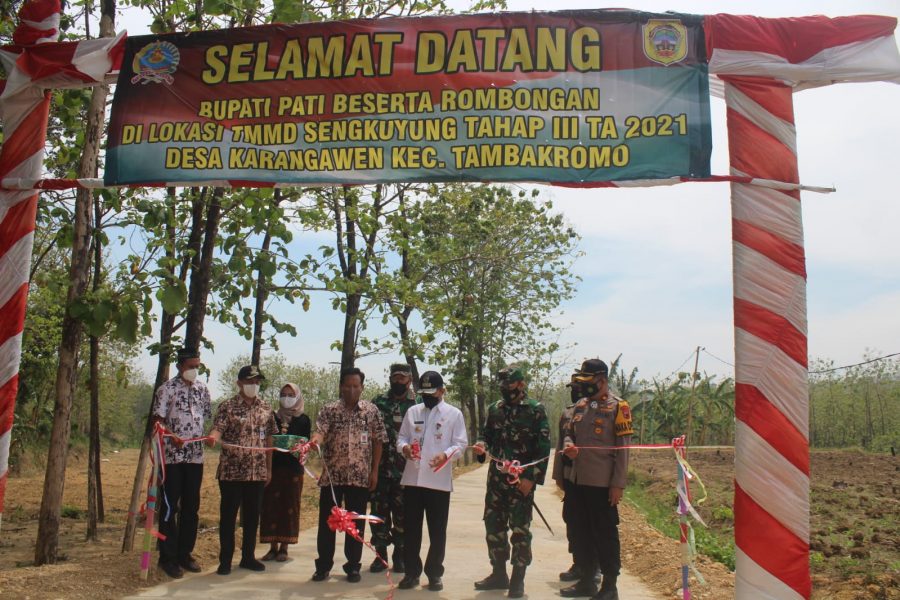 Dalam kesempatan tersebut Bupati Pati bersama Dandim 0718/Pati menandatangani naskah penyerahan program TMMD serta pengguntingan pita peresmian sasaran pengecoran jalan di desa Karangawen kecamatan Tambakromo.Kamis,(14/10/2021).