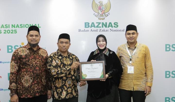 Piagam penghargaan diserahkan oleh Ketua Umum Badan Amil Zakat Nasional (Baznas) RI Noor Achmad pada acara penganugerahan di Hotel Mercure Ancol, Jakarta. Kamis, 28 Agustus 2025.